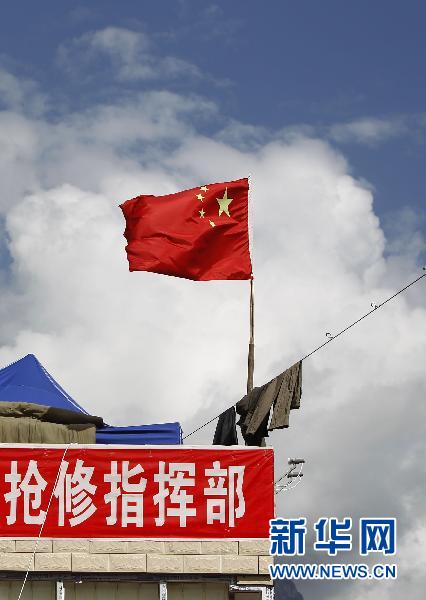 8月19日,在舟曲縣搶險救災的一家通訊公司將五星紅旗豎立在公司指揮部樓上。行走在甘肅舟曲災區,總有一抹醒目的紅映入眼簾:民房上、帳篷旁,在災民安置點、各救災單位,處處可見鮮艷的國旗和黨旗迎風飄揚,鼓舞人心,給人力量。