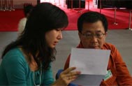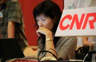 中央臺總編室新聞宣傳管理處處長劉磊在審聽直播前試音