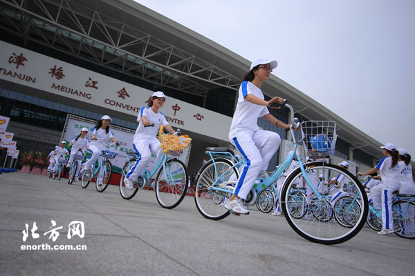 天津北方網訊:3日下午,2010天津夏季達沃斯論壇城市志愿者騎行隊成立暨“綠色騎行、快樂低碳”宣傳活動啟動儀式在梅江會展中心前廣場舉行。200位志愿者騎行隊員將深入本市主要街道和居民社區,向市民和游客廣泛宣傳天津夏季達沃斯論壇和低碳環保理念。