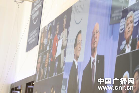 梅江會展中心的墻上醒目地掛著往屆達沃斯論壇回顧的巨幅照片。(中廣網(wǎng)記者朱虹 攝)