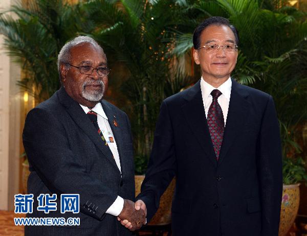 9月13日,國務(wù)院總理溫家寶在天津會見來華出席夏季達(dá)沃斯論壇的巴布亞新幾內(nèi)亞總理索馬雷。 新華社記者 姚大偉 攝