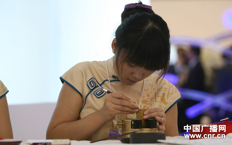 2012夏季達沃斯論壇在天津梅江會展中心舉行,除了例行商務會議,會展中心正中中國傳統文化的展示,吸引了大量來賓,天津以印刻,茶道,水墨畫,中國結這四種傳統的中國技藝,展現中國文化的博大精深。留下姓名即可獲贈印刻,現場的水墨畫可以作為紀念品,中國結也是作為禮物送給與會各方的,而茶品則是休息時難得的體驗。圖為制作印刻的姑娘。(中廣網記者 陳曉冉 攝)