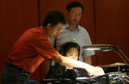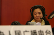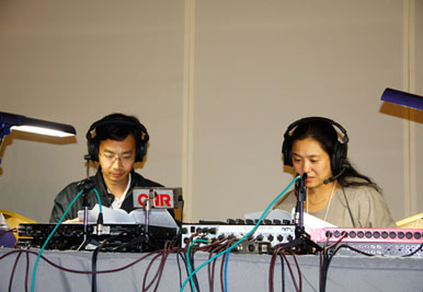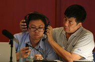 技術中心周俊生給經(jīng)濟之聲記者黃耀偉戴監(jiān)聽耳機