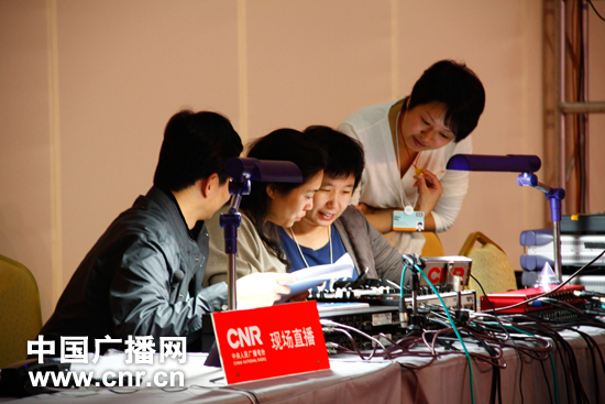 總編室趙威、聶巧與兩位主持人討論直播事宜(中廣網記者劉夢 攝)