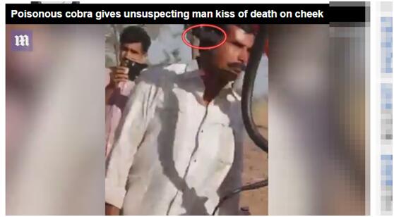 根據英國《每日郵報》報道,這起意外發生在印度的久德浦爾市(Jodhpur),該男子原本在觀看舞蛇人的表演,舞蛇人把眼鏡蛇繞到該男子脖子上,這舉動激怒了眼鏡蛇,于是蛇咬了男子的臉頰一口。