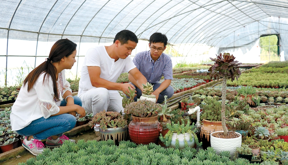 2013年,80后大學生夏云潮和陸立芝夫婦在外打拼多年后,回鄉創辦多肉植物種植公司。他倆投資200萬元、流轉20多畝土地,興建2.2萬平方米的溫室連棟大棚種植多肉植物。他們還開了兩家淘寶網店,通過線上線下批發銷售,年創產值140多萬元,同時帶動當地300多戶貧困戶創業就業。