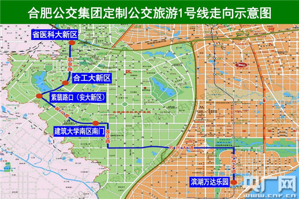 定制公交旅游1號線停靠站點為:省醫科大新區、合工大新區、紫翡路口、建筑大學南區南門、濱湖萬達樂園。