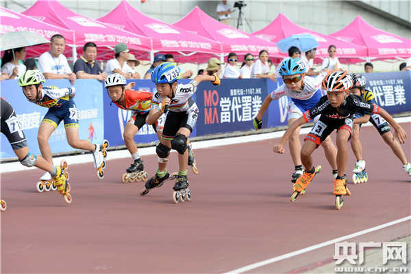 央廣網合肥7月31日消息 7月30日,選手正在第32屆全國速度輪滑(場地)錦標賽青年男子組10000米積分淘汰賽中。(徐小玲 張大崗攝)