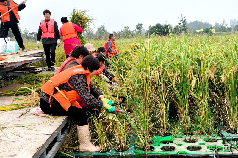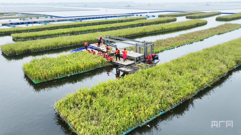 浮床水稻目前主要依靠人力收割(央廣網發 尹欣、徐璐璐攝)
