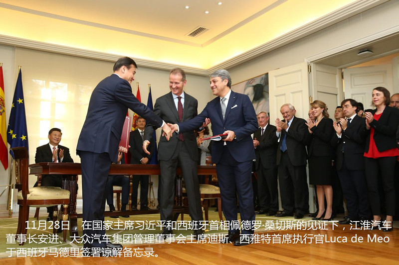11月28日,在中國國家主席習近平和西班牙首相佩德羅·桑切斯的見證下,江淮汽車集團股份有限公司與大眾汽車集團(中國)及西雅特汽車公司在西班牙巴塞羅那簽署諒解備忘錄。