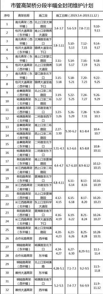 為保證高架橋道路安全運行和市民安全出行,經合肥市人民政府批準,擬定于2019年3月至11月,對南北高架、包河大道高架等九條高架橋道路進行四個周期部局養護修繕。依據《中華人民共和國道路交通安全法》第三十九條、《中華人民共和國道路交通安全法實施條例》第三十五條之規定,現就道路施工相關事項公告如下: