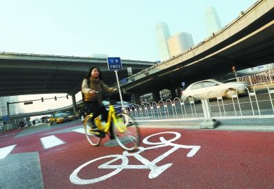 昨天下午,市民在國貿橋下剛剛鋪設完成的彩色自行車道內騎行。目前,三環輔路慢行系統整治工作已接近尾聲,全線4.8萬平方米的彩色自行車道及標識牌全部鋪裝完成。本報記者