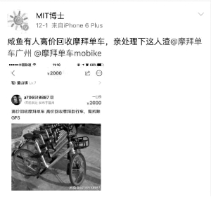 原標題:網上回收共享單車開價2000元