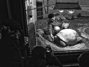 食蟻獸沒有絨毛,看似挺長的尾巴其實都是硬刺,專用來遮擋毒辣的陽光,因此他們最怕冷。食蟻獸的房間里既有暖氣又有浴霸,10歲的南南吃完早餐正在散步,一副愜意的樣子。象龜的家比食蟻獸家多了暖風設備,一進獸舍恍若來到熱風襲面的赤道地區(見圖)。飼養員說,這里的三頭象龜都來自塞舌爾,浴霸不僅供暖用,更起到“回家”的作用,“這些大家伙喜歡太陽的強光,浴霸的光對他們來說,就是太陽光,離不了。”豹紋守宮和西非擬蜥這些爬行動物個頭都小巧,飼養員干脆把電線埋在“石頭”里,制作成發熱石,這些小家伙則更愿意趴在上面伸懶腰。