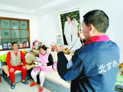 北京熱力石景山分公司魯谷服務中心五芳園服務站的工人師傅,來到魯谷路39號院2單元一戶居民家中測量室溫,客廳溫度超過20℃。記者 吳鏑攝