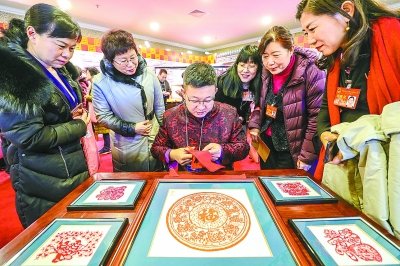 1月13日,“為民族傳承,為生活創(chuàng)新——北京市非物質(zhì)文化遺產(chǎn)保護(hù)工作成果展”在市十五屆人大二次會(huì)議代表駐地舉行,非遺傳承人為代表們展示剪紙技藝。本報(bào)記者武亦彬 攝