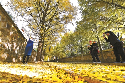 在圓明園的三園交界處,有一條近千米的銀杏大道,大道兩側(cè)種植著整齊的銀杏樹,樹枝上的銀杏葉和滿地的落葉形成了一條黃金大道。黃燦燦的銀杏葉又和兩側(cè)圍墻上紅色的藤蔓相互映襯,美不勝收。