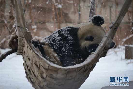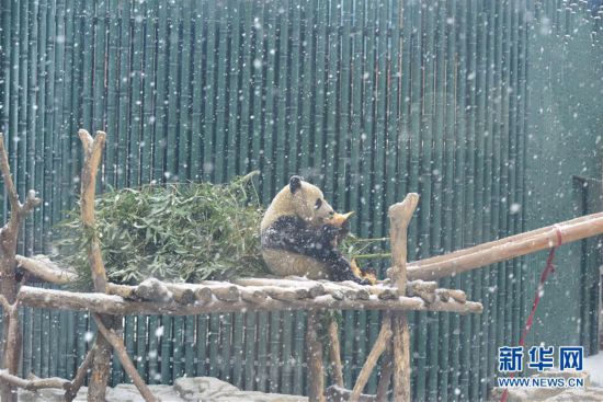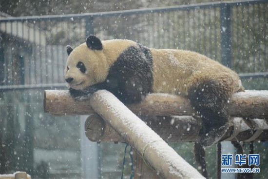 當日,北京迎來降雪,北京動物園的大熊貓在雪中嬉戲撒歡兒。