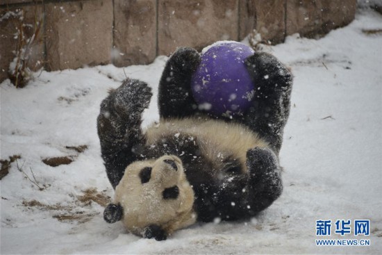 2月12日,北京動物園的大熊貓在雪中耍球。