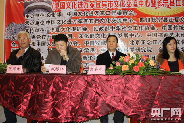 會上,中國文化進萬家工作委員會武振江主任首先致開幕詞,他說,歡迎大家做客長寧竹石林景區,對于中國文化進萬家宜賓文化交流中心的成立和江夏文化研究會的揭牌儀式表示祝賀,希望大家共同為文化產業的大發展獻計獻策,同時他也希望大家可以通過這個平臺多多參與到有意義的文化活動去,把文化進萬家做到實處,以更多的文化惠民工程惠及百姓。