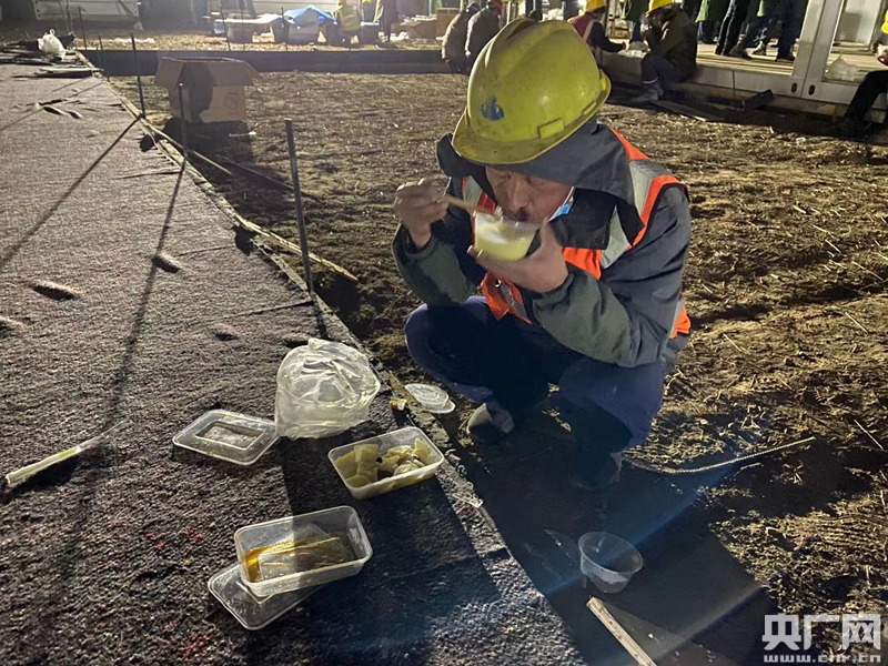 施工人員插空蹲在路邊吃飯(總臺央廣記者 錢成 攝)
