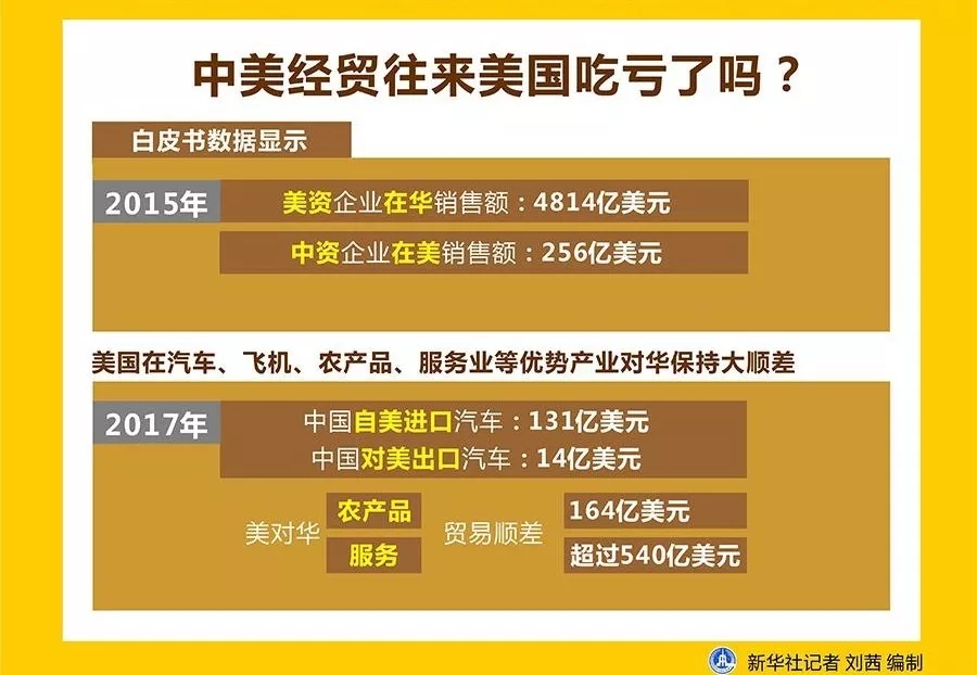 相關的數據也顯示,美國在多領域對華保持大順差。傅自應指出:“美國在汽車、飛機、農產品、服務業等優勢產業都對華保持大順差。2017年中國自美進口汽車131億美元,對美出口汽車14億美元。美對華農產品貿易順差達到164億美元。美對華服務貿易順差超過540億美元。”