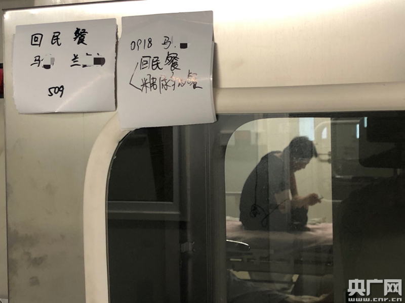 6月16日,北京地壇醫(yī)院第五病區(qū),透過貼有供餐需求的消毒傳遞柜,可以看到患者正在病床上看手機(jī)(中央廣播電視總臺(tái)央廣記者 白杰戈 攝)