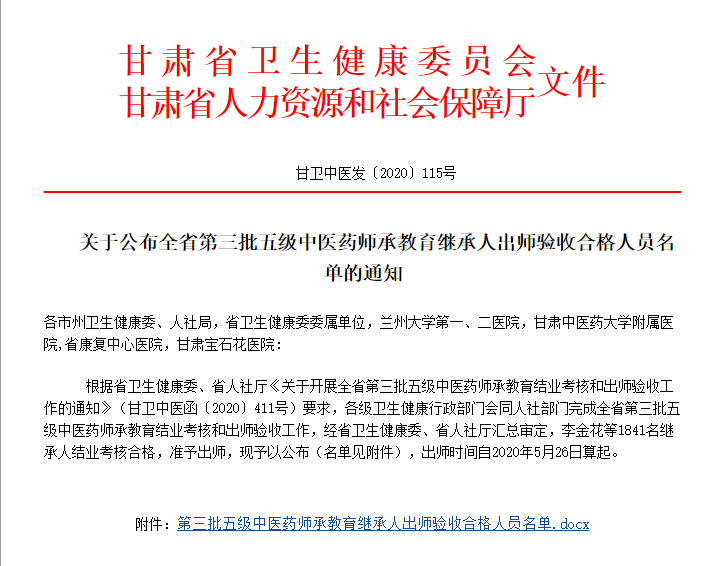 央廣網北京9月22日消息 據中央廣播電視總臺中國之聲《新聞有觀點》報道,近日,甘肅省衛健委公布了全省第三批五級中醫藥師承教育繼承人“出師”驗收合格人員名單,1841名中醫繼承人順利出師,其中有99名省級繼承人,1742名市縣鄉村繼承人。