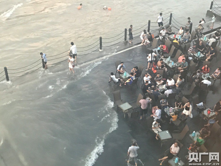 傍晚江邊戲水的水富市民