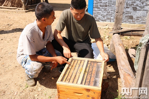 長安村駐村第一書記楊立山查看蜂箱(央廣網發 駐村工作隊供圖)