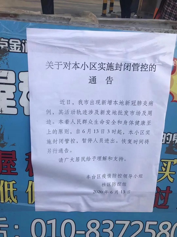 鄰近新發地市場的11個小區13日開始封閉式管理(央廣網發 封閉管理小區居民供圖)