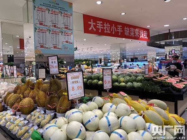 首航超市七里莊店,菜肉水果供應充足、價格適中(中央廣播電視總臺央廣記者 肖源 攝)