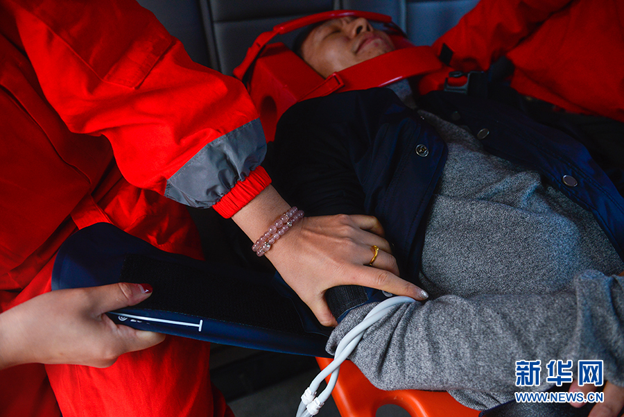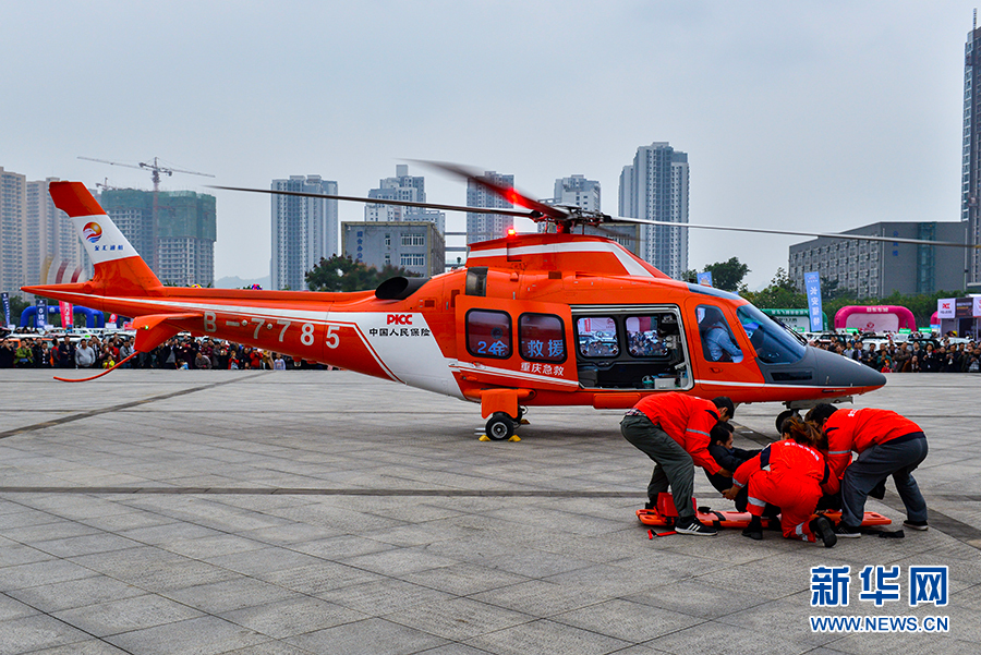 11月12日,航空應急醫療救援在重慶市璧山區舉行,轉移到直升機后,救援人員對病人實施必要的急救措施。新華網 李相博 攝 -