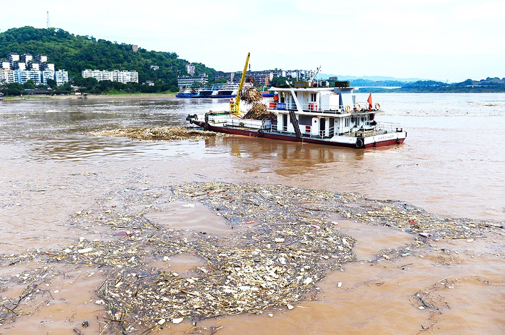 7月10日,長江郭家沱滾裝船碼頭,水上環衛工駕駛機械化專業清漂船抓取江面上的漂浮垃圾。隨著洪水過境,加之地勢原因,漂浮垃圾大量聚集在郭家沱水域。據介紹,這里的三艘機械化專業清漂船配備14名環衛工,每天早上7點開始作業,一直要忙到天黑,每天清理垃圾近80噸,是平時的2.5倍。記者 張錦輝 攝