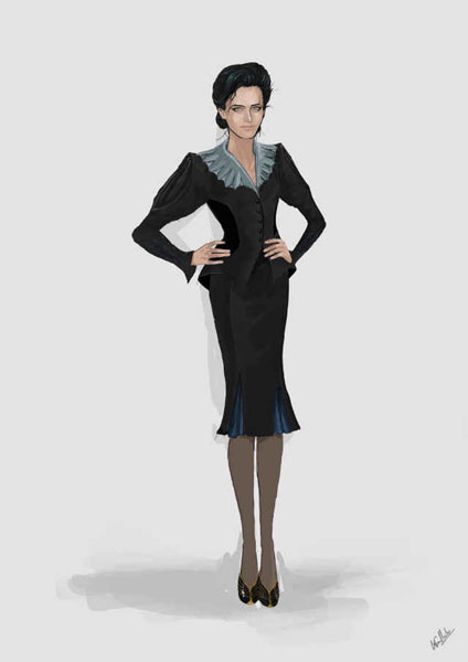 《佩小姐的奇幻城堡》電影中分別有兩個時間點,1943年和2016年,柯琳需要準備兩個時代的服裝,復古與現代時尚的融合是這部電影的一大美術特點。從曝光的劇照來看,愛娃·格林飾演的“佩小姐”的妝容就是復古時期的經典代表,而她的服裝又給她的角色制造了更多神秘感。
