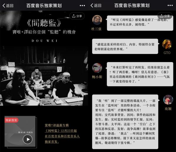 23日專輯首發后,百度音樂就發起了“竇唯+譯給你一個‘監聽’的機會”專題活動,引導用戶發布從《間聽監》中“監聽”到的內容評論,不少人都在專題后留下了自己的感受。