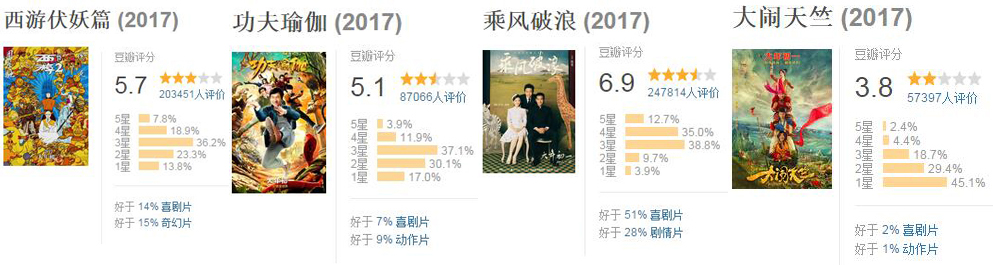 2016年的中國(guó)電影市場(chǎng)在眾多“聲音”和“現(xiàn)象”中結(jié)束,2017春節(jié)檔成為觀眾期待的電影盛宴,《西游伏妖篇》、《功夫瑜伽》、《大鬧天竺》、《乘風(fēng)破浪》等影片吊足了觀眾胃口,但這聲勢(shì)浩大的表象背后卻依然是讓觀眾差強(qiáng)人意的質(zhì)量。除《乘風(fēng)破浪》后來(lái)居上實(shí)現(xiàn)口碑票房逆襲外,其余影片均沒(méi)有獲得觀眾好評(píng),豆瓣評(píng)分均未過(guò)及格線,《大鬧天竺》更是只收獲3.8分。回想《大鬧天竺》深入三四線城市“60天50城”的賣(mài)力宣傳,隱約透出一絲尷尬的氣息。
