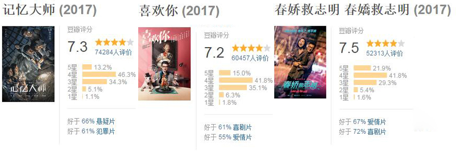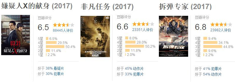 值得安慰的是國(guó)產(chǎn)電影并沒(méi)有表現(xiàn)出持續(xù)低迷的狀態(tài), 《嫌疑人X的獻(xiàn)身》6.5分、《拆彈專(zhuān)家》6.8分、《記憶大師》7.3分、《非凡任務(wù)》6.6分、《喜歡你》7.2分、《春嬌救志明》7.5分 ,影片評(píng)分走出低谷,收獲觀眾的認(rèn)可。