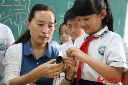 圖為6月4日河北省邯鄲市廣平縣第二實驗小學學生在老師的幫助下學習包粽子。