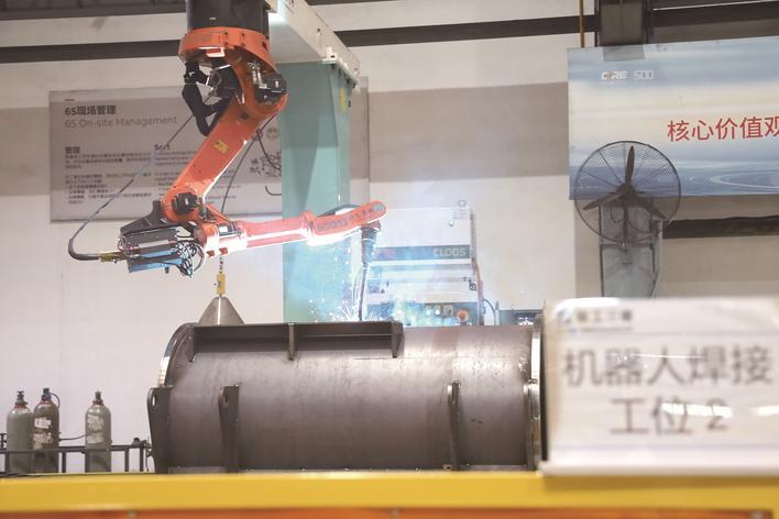 廈工(三明)重型機器有限公司車間內的焊接機器人正精準焊接機座筒體。