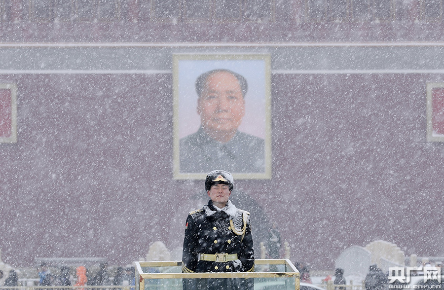 2月12日,北京降雪,天安門(mén)廣場(chǎng)上,正在雪中執(zhí)勤的哨兵。央廣網(wǎng)記者 韓靖 攝
