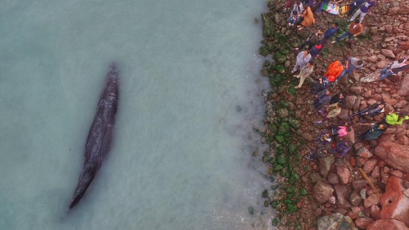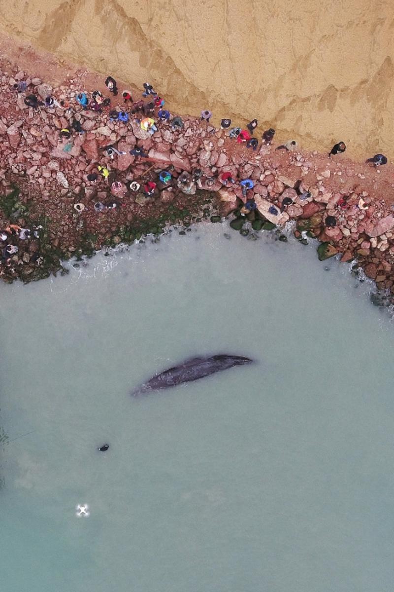 人們?cè)谠,注視著這頭迷失方向、擱淺在深惠海域的抹香鯨,陪它走完“鯨生”的最后一程。