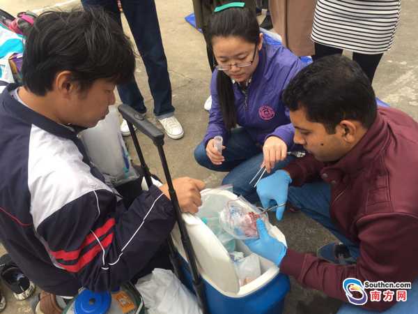 有專家在現場稱,“解剖發現有乳汁,這是一頭哺乳期母鯨”。據悉,解剖取樣可能持續到明天結束 。專家將對抹香鯨開展生理結構、分子生物學、生態及病理等方面的研究工作,分析死因,以期為抹香鯨這一瀕危種群的保護提供更多具有科學價值的數據和理論。圖為來自汕頭大學的專家在對抹香鯨的乳腺取樣。
