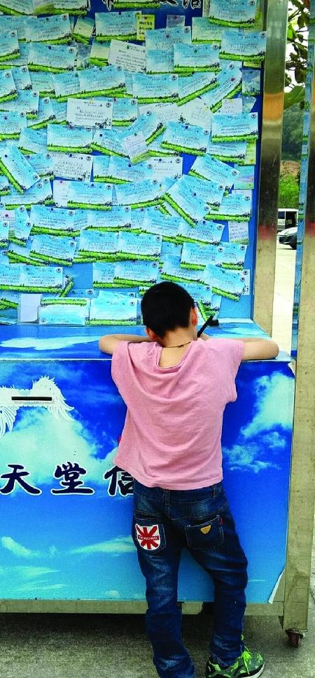 市殯儀館館長羅楠介紹,從2014年下半年開始,該館在殯葬業務大廳推出“天堂信箱”寄哀思活動,“主要是讓市民對剛去世的親人表達一種感情,減少痛苦。”目前,市殯儀館保管著1.2萬個骨灰盒,多數市民會在清明節前來祭拜,為了讓市民多一個寄托哀思的方式,去年起“天堂信箱”活動在該館全面推行,多個服務區域均設有“天堂信箱”。