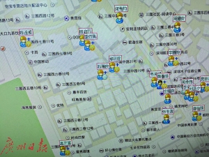 在清潔公司的后臺系統上記者看到,地圖上他們負責的區域,實時顯示人員的名字、行動軌跡。