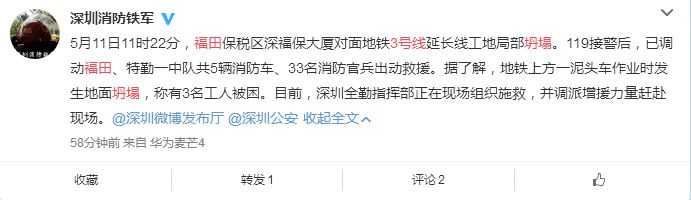 南方網(wǎng)訊 據(jù)深圳市公安消防支隊(duì)的官方微博@深圳消防鐵軍通報(bào),5月11日11時(shí)22分,福田保稅區(qū)深福保大廈對(duì)面地鐵3號(hào)線延長線工地局部坍塌。