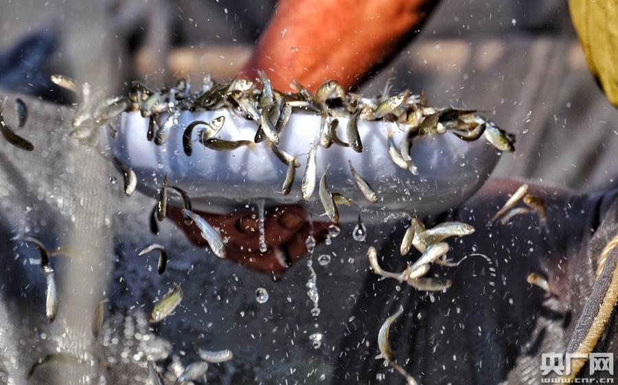 九江水產(chǎn)養(yǎng)殖師傅在表演傳統(tǒng)技藝開側(cè)及數(shù)魚花。(央廣網(wǎng)發(fā) 通訊員陳國杰供圖)