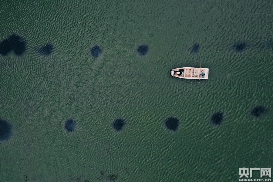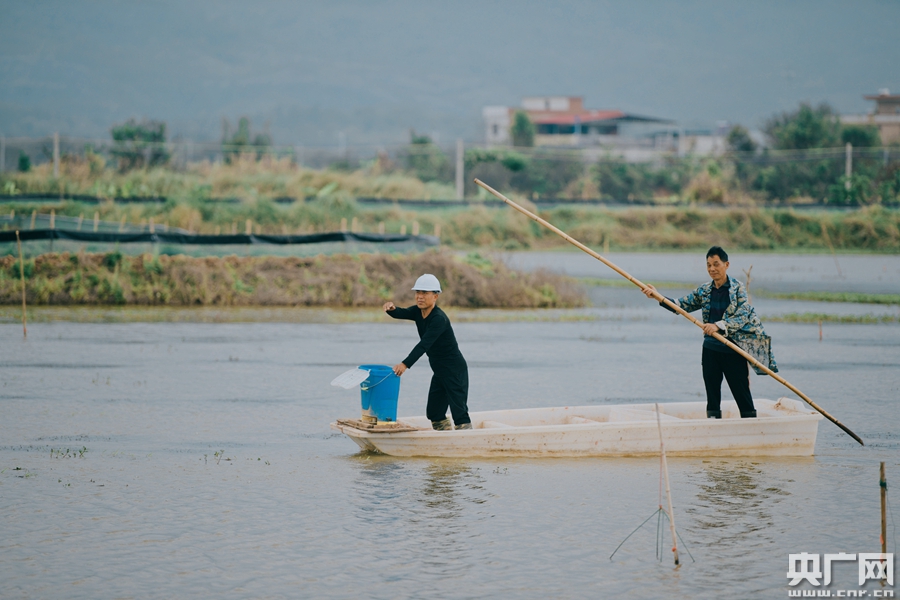 養殖戶乘坐小船駛過稻蝦田。(央廣網記者 官文清攝)