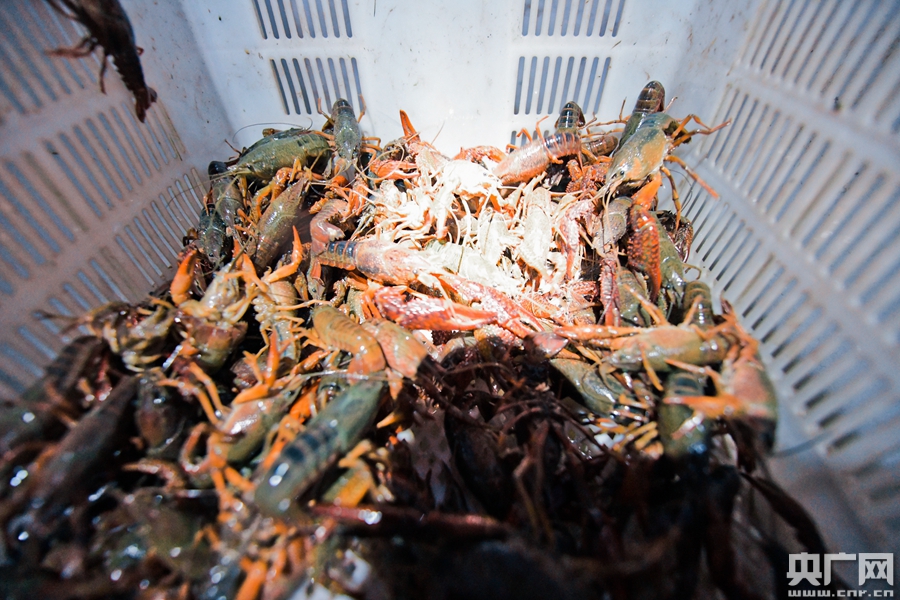為了能讓小龍蝦盡早端上消費者的餐桌,養殖戶需要在凌晨將小龍蝦捕撈上岸。(央廣網記者 官文清攝)