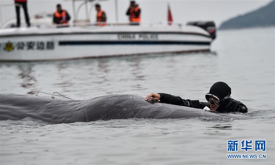 3月14日,在惠州港油庫碼頭附近海域,搭載著專家和漁政工作人員的船只停在抹香鯨旁。新華社記者 毛思倩 攝